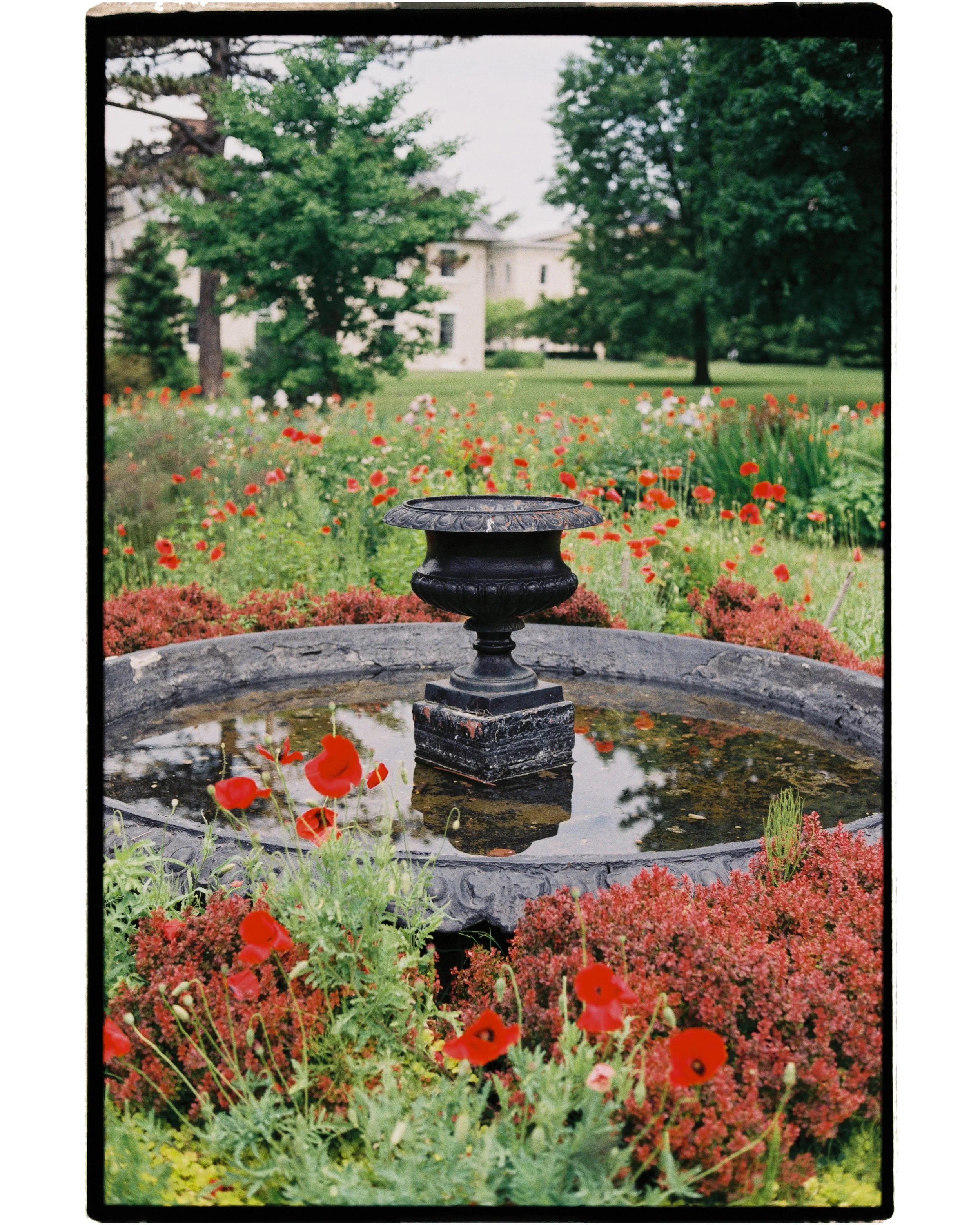 A black decorative fountain with a water basin surrounded by red flowers in a garden, with trees and residential buildings in the background.